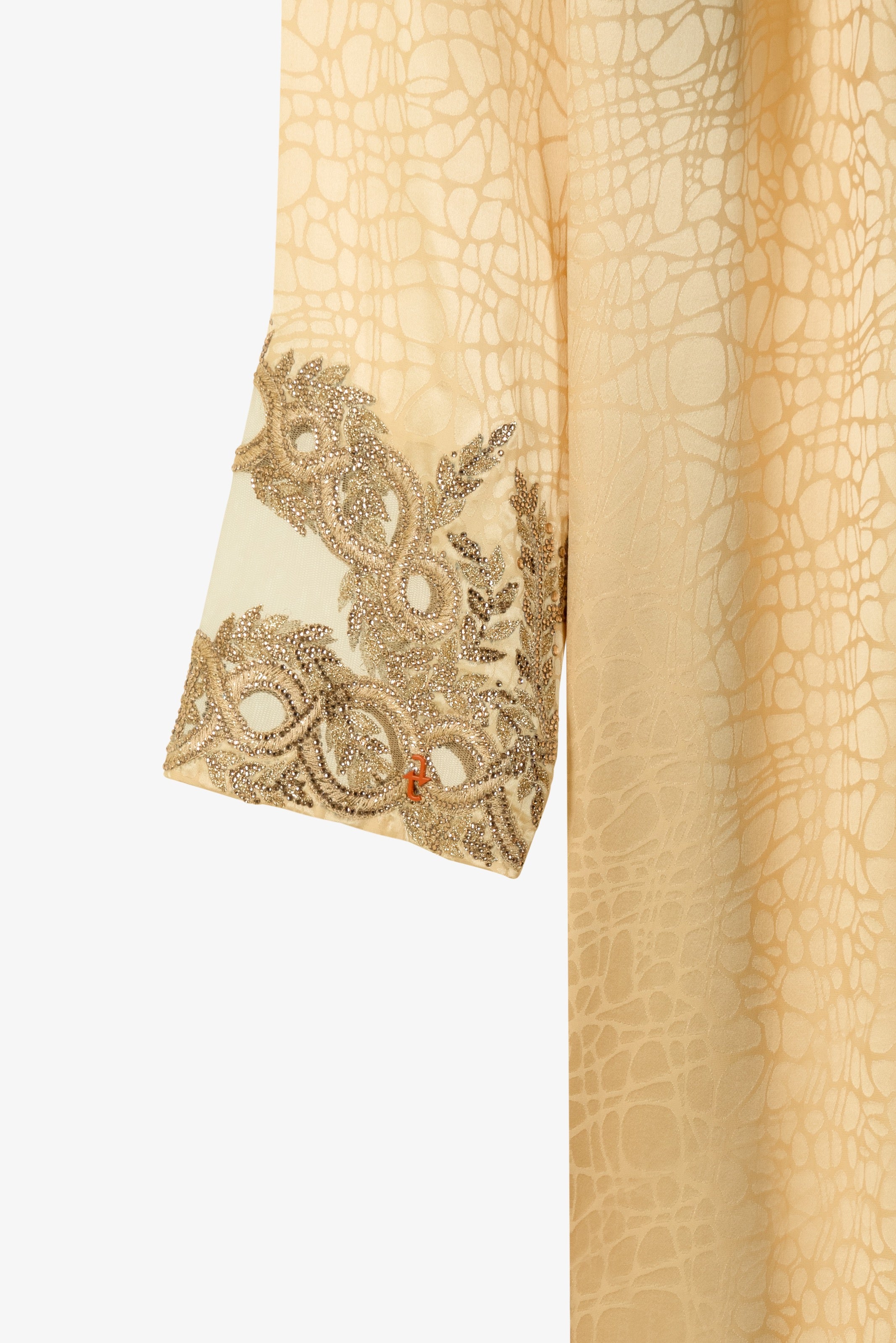 An elegant expression of craftsmanship, this design showcases floral embroidery adorned with hand-set crystals along the neckline and cuffs, creating a soft luminosity against the jacquard weave. The sheer neck panel introduces a modern feminine edge. Ideal for evening occasions, celebrations, or refined festive gatherings, it embodies Another Ateliers signature modern romanticism.