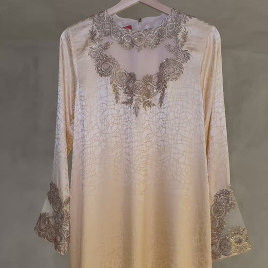 Maxi Kaftan in italian silk jacquard square print with a inch round neckline opening and loose sleeves. A-line silhouette. The Front panel and sleeves embellished with crystals from preciosa in a floral pattern. Made in Dubai.