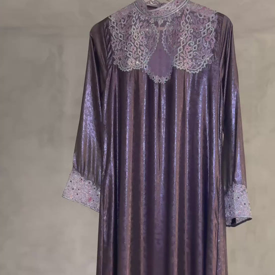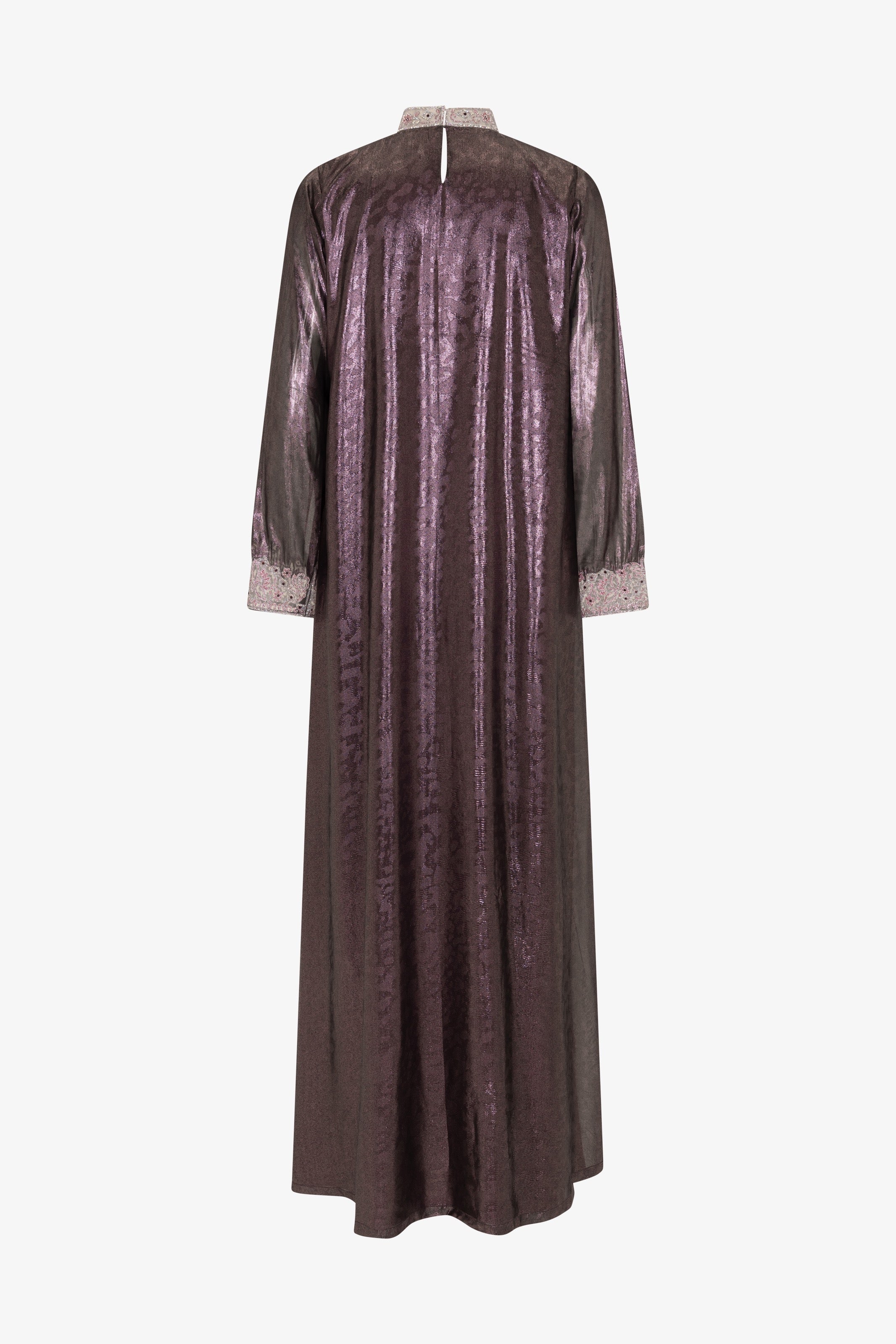 Maxi Kaftan in shimmer chiffon with a high round neckline and loose sleeves. A-line silhouette. The Front panel and sleeves embellished with crystals from preciosa in a pattern inspired by the square geometric form. Made in Dubai.