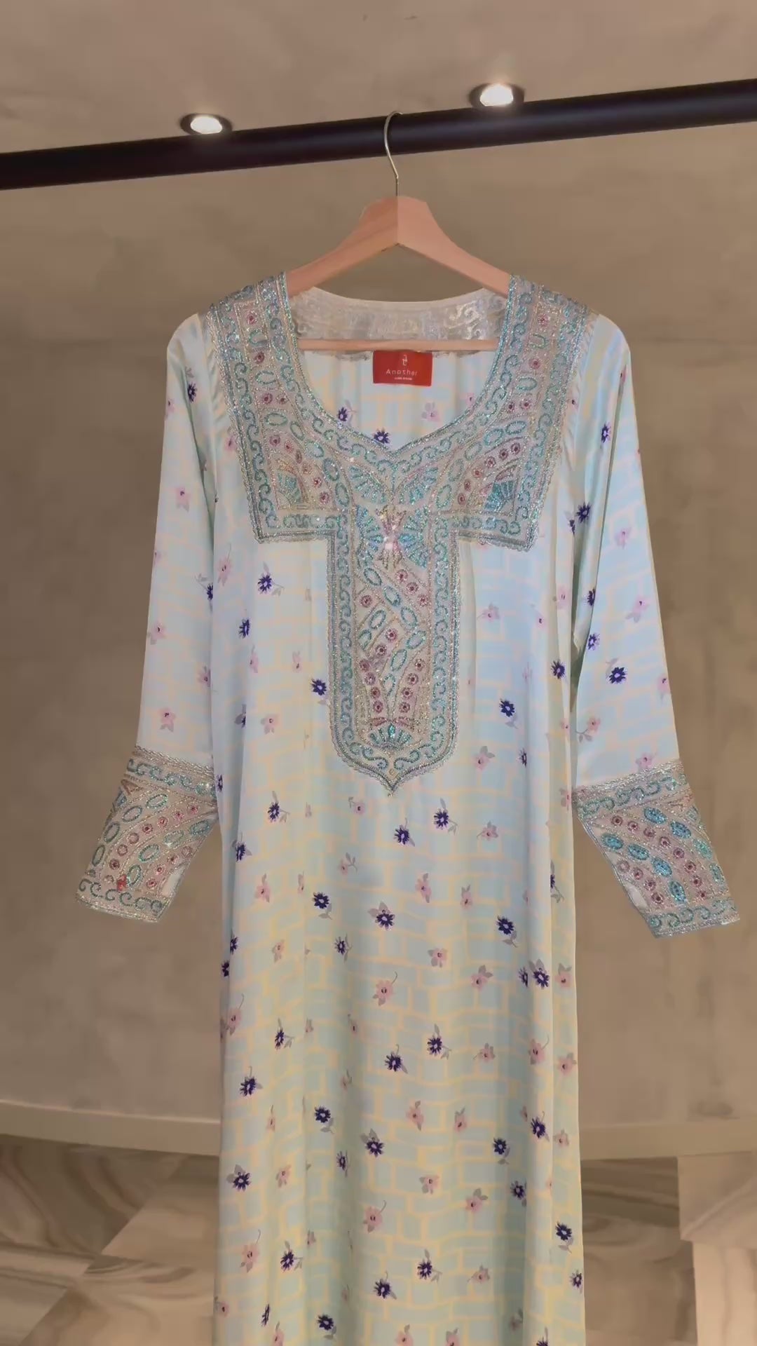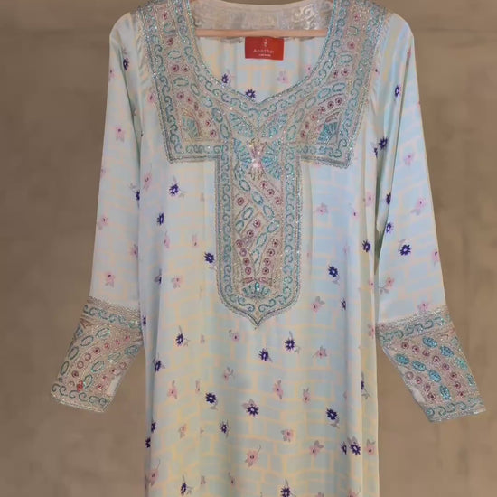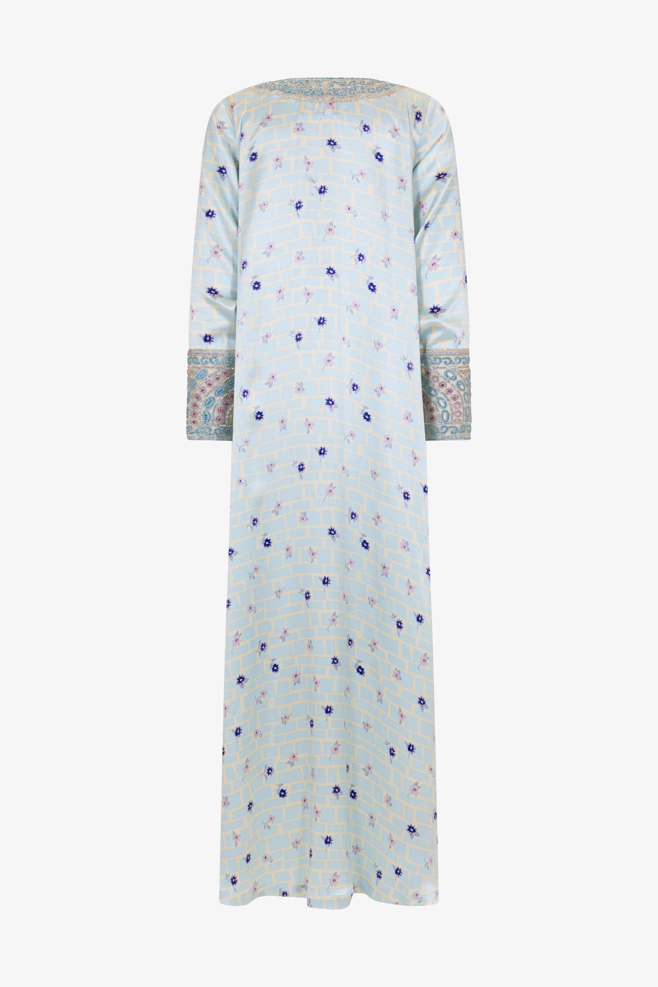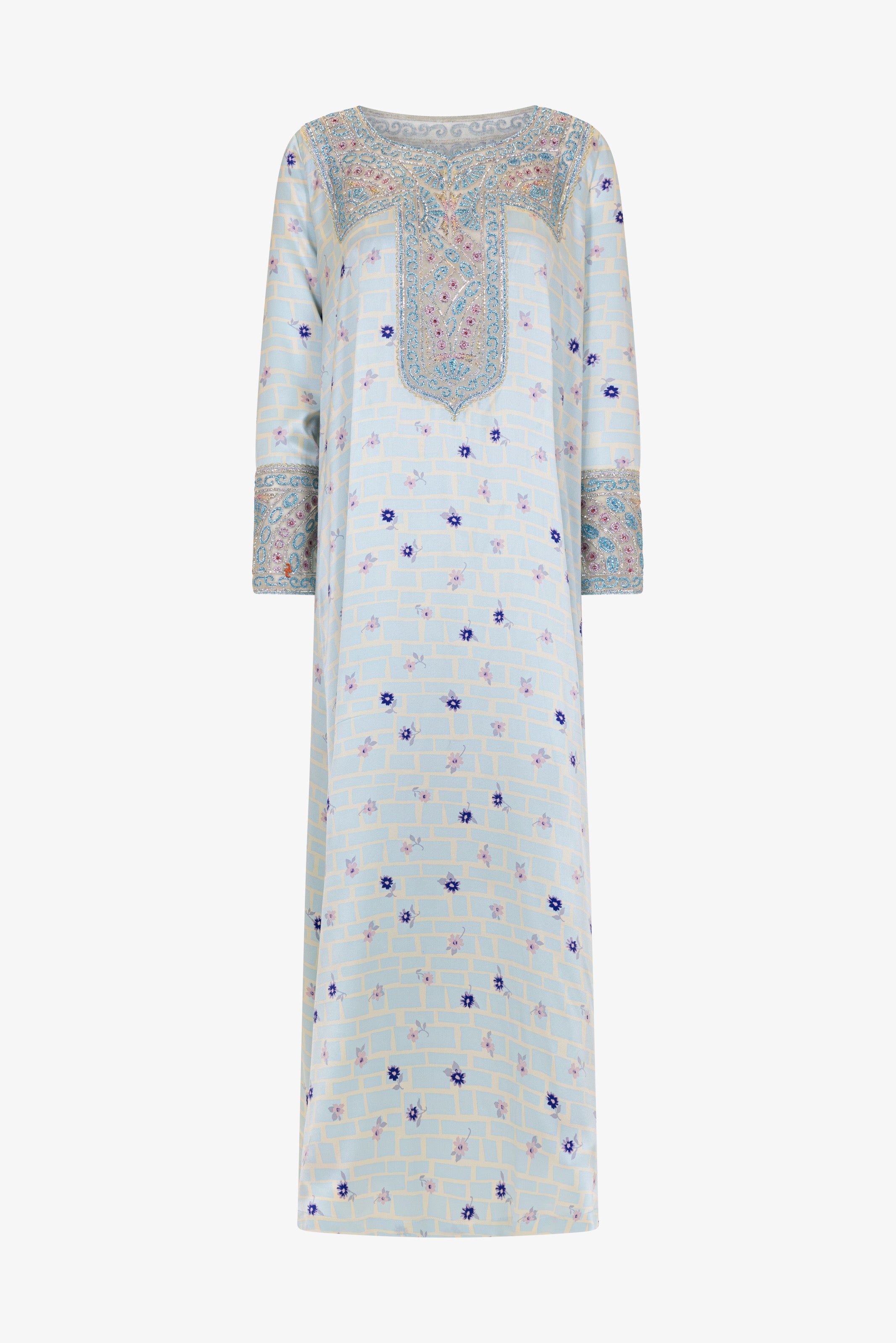 Maxi Kaftan in italian jacquard silk charmeuse square print with an 7x7.5 inch round neckline opening and fitted sleeves. A-line silhouette. The Front panel and sleeves embellished with crystals from preciosa in a pattern inspired by the square geometric form. Made in Dubai.