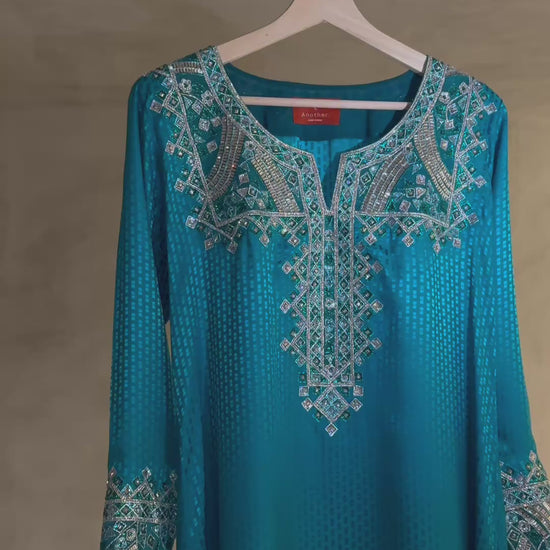 A refined and exquisite piece, hand-embellished with over 10,000 crystals from Preciosa. The intricate embroidery extends across the neckline and sleeves, forming a striking geometric pattern that highlights the brand’s signature craftsmanship. A timeless design that captures understated opulence — perfect for evening occasions or elegant celebrations.