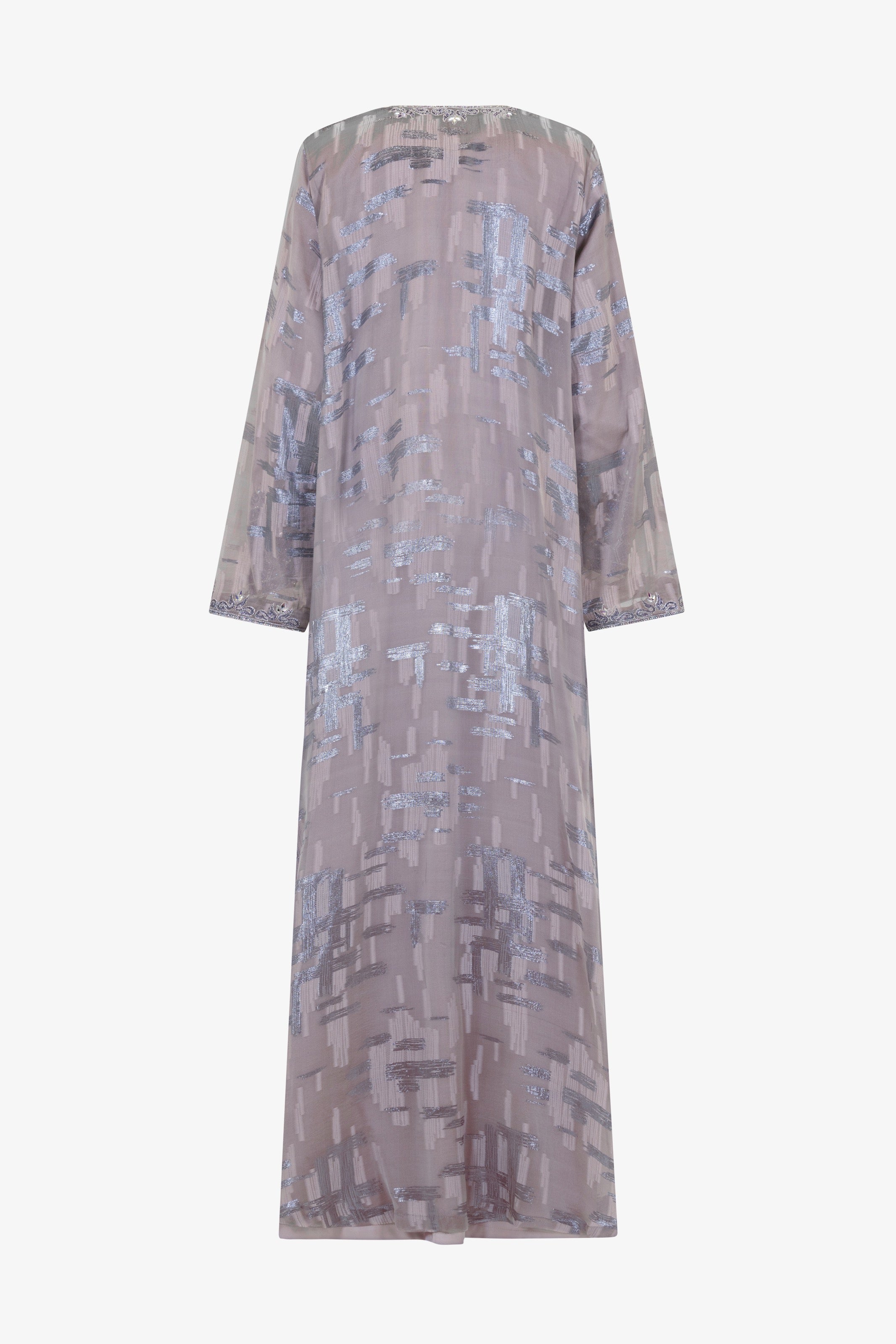 Three-piece set featuring an outer layer in silk chiffon, an inner layer in silk crepe, and a matching plain head scarf. The outer layer embroidered on the neckline and sleeves, designed with side slits and an A-line silhouette. The inner layer embroidered with crystals from preciosa inspired by geometric forms and designed in an A-line silhouette. Made in Dubai.
